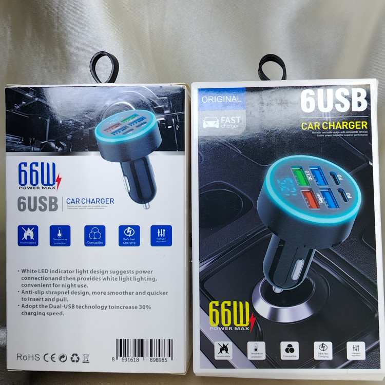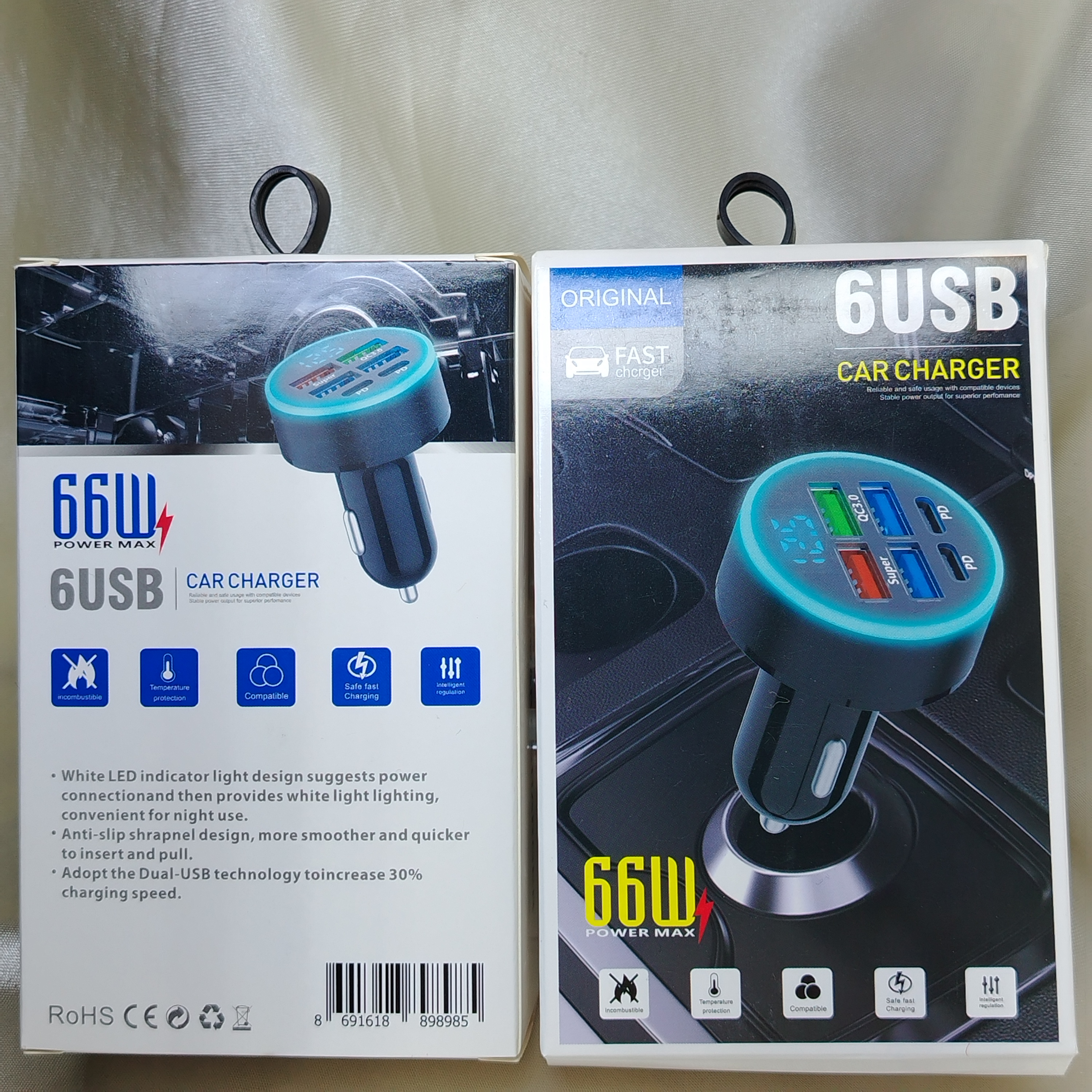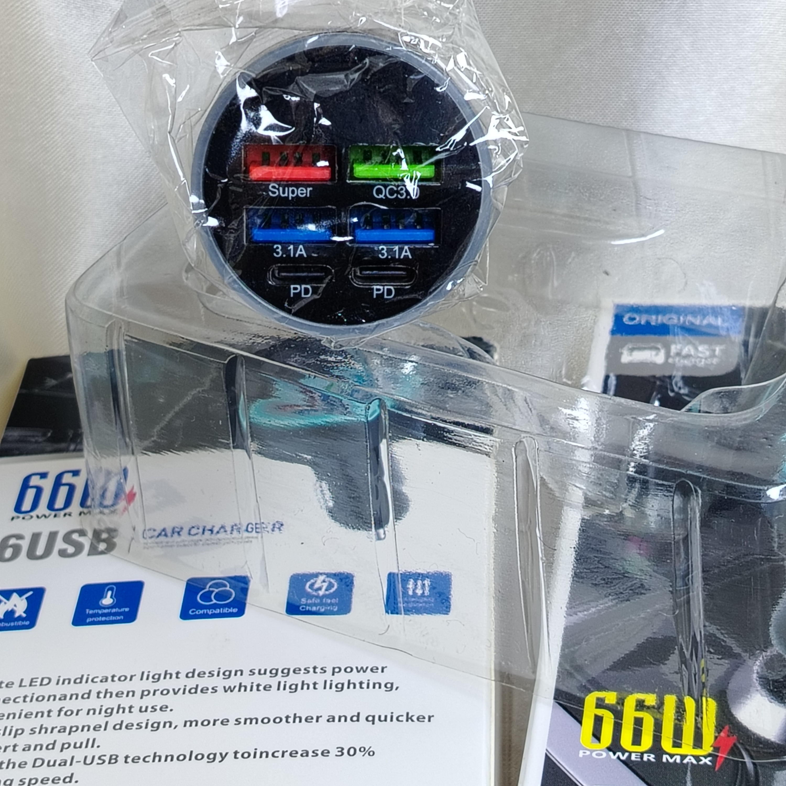 شارژر فندکی 66 وات با 4 پورت خروجی و دو پورت type c pd، قدرتمندترین گزینه برای شارژ سریع دستگاههای مختلف در خودرو. فناوری شارژ سریع هوشمند برای محافظت از باتری دستگاه شما.